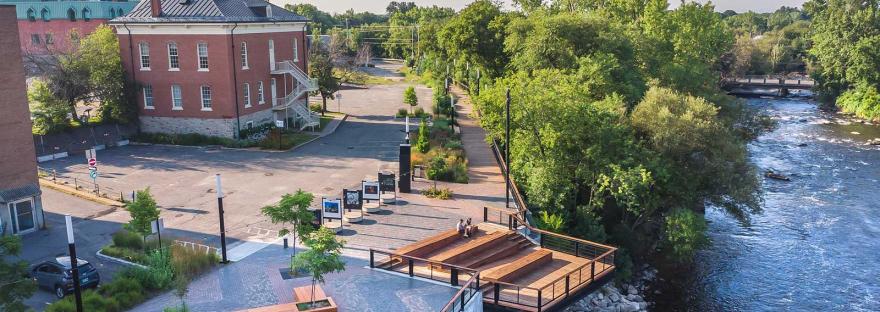 En photo : une belle vue sur la phase 2 du Jardin des Arts de la Ville de Saint-Jérôme, en bordure de la rivière du Nord, qui a également été complétée en 2025. Le projet a été nommé Grand Lauréat de la 18e édition des Grands prix du design! (source de la photo : WAA+ / page Facebook de la Ville de Saint-Jérôme).