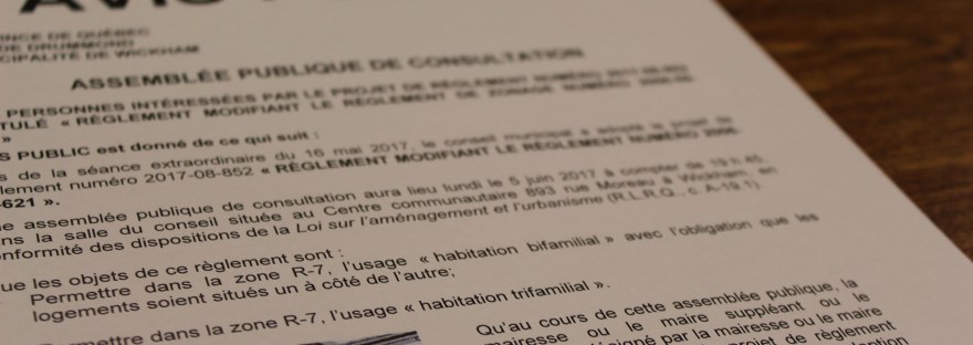 Morrissette c. Ville de Saint-Hyacinthe, 2019 QCCA 1666 Ce matin, nous résumons un court arrêt de la Cour d’appel du Québec qui a été porté à notre attention par nos collègues de l’équipe des Affaires juridiques de l’Union des municipalités du Québec. Cet arrêt concerne les conséquences d’une erreur dans la rédaction d’un avis public… Lire la suite Une erreur dans l’avis public de consultation n’entraîne pas la nullité du règlement, à moins d’avoir causé un préjudice réel